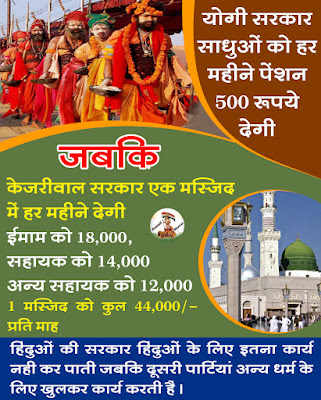हाल ही में 2 खबरें ज्यादा सुर्खियों में रही, पहली थी कि योगी सरकार साधु-संतों को भी देगी पेंशन, दूसरी खबर थी कि केरजीवाल सरकार दिल्ली के मस्जिदों के इमामों को वेतन देगी ।